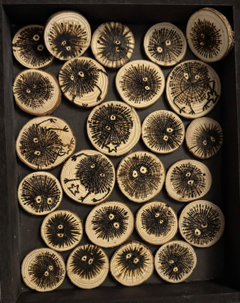 Artwork, paintings, sculptures, handmade jewelry, textile creations like tapestries and scarves. Also book art, multi media works, and ornaments. Face painting services and art activities.